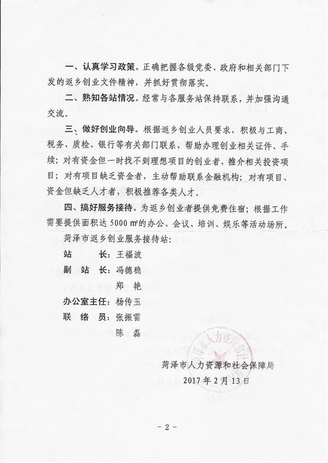 菏泽市返乡创业服务接待站于2017年经菏泽市人社局批准成立,几年来一直致力于为返乡创业人员提供免费住宿、项目洽谈、企业注册落地等服务,受到…