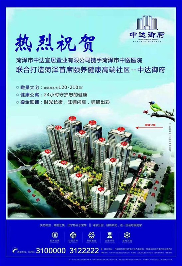 中达·御府位于丹阳路与和平路交汇处西南角,占地面积近100亩,建筑面积约33万平方米,内部配套2200㎡智慧幼儿园。拟建设精装修、氧气入户、一键紧急呼叫、健康直饮水、地暖、24小时健康服务平台6大至尊配套。且项目地理位置优越,邻近菏泽市大剧院、菏泽市图书馆占据菏泽优质自然资源和人文资源,建成后将成为菏泽开发区一颗耀眼的明珠,菏泽大健康文化的领跑者。