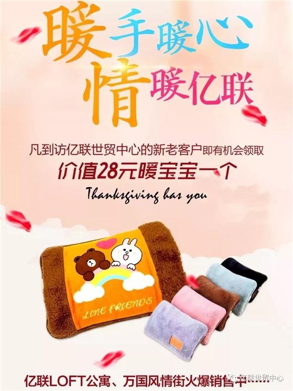寒冬瑟瑟冷风飘飘,暖手暖心,情暖亿联,凡到访亿联世贸中心的新老客户即有机会领取价值28元暖宝宝一个。