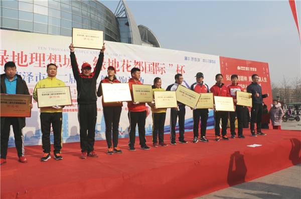 随着菏泽市人民政府副秘书长孟凡荣打响发令枪,在出席领导的带领下,参加比赛的市民有序跑出起跑门,他们从绿地理想城出发,迈着矫健的步伐,经长城路与天香路,奔跑约7公里到达终点大剧院牡丹广场并举行颁奖仪式。参加健身跑的全体队员以饱满的精神状态,兴致勃勃地跑完全程。14支参赛的健身快走队动作整齐,着装鲜艳,口号嘹亮,各展风采,受到主办方和群众的一致称赞。
