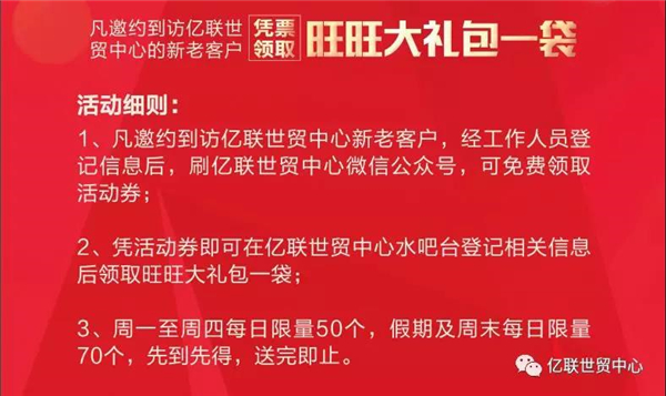1、凡邀约到访亿联世贸中心新老客户,经工作人员登记信息后,刷亿联世贸中心微信公众号,可免费领取活动券;