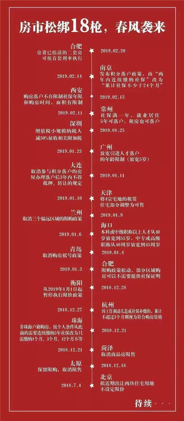 截止目前,全国已有超18个城市楼市调控松绑,这场轰轰烈烈的松绑“春风”,在大中小城市,都吹了起来!放宽落户!降低买房门槛!利率下调!取消限购!取消限价!限售取消!一枪枪直击购房者的“心”!