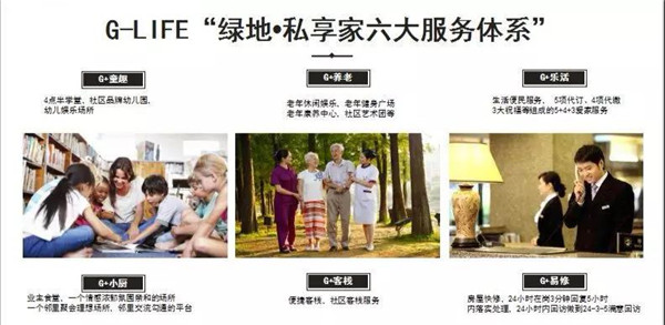 顶级的产品,同样需要顶级的物业来服务,绿地·理想城全面导入G-LIFE“绿地•私享家六大服务体系”——G+童趣、G+养老、G+乐活、G+小厨、G+客栈、G+易修。