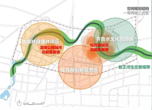空间规划结构为一带两核三片区。一带即赵王河生态景观带;两核为湿地公园城市功能聚集核和牡丹湖城市功能聚集核;三片自西往东分别为水森林健康休闲区、牡丹湖创新服务区、中原水文化旅游区。