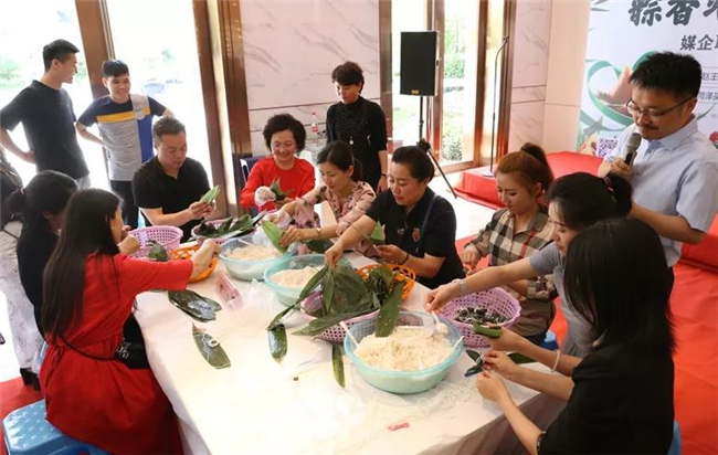 再有两天,就是我国传统节日端午节了,又是一年端午时,情浓粽飘香。端午节,包粽子,是中华民族古老的传统节日之一,到场的媒体人对包粽子表现出了非常高的热情,纷纷一试身手,亲手体验一下包粽子的感觉。现场的包粽子比赛更是把活动气氛推向了高潮,挑选出的三组媒体人参加比赛,整盆的糯米,整齐的粽叶,蜜枣一字排开,在专业包粽师指导下,填糯米、裹叶子、扎线,一片片粽叶在他们的手中,随意弯曲,轻轻一卷,就成了一个上大下小的“小碗”,再抓把糯米放进去一卷,粽子的形状就出来了。经过角逐,主持人队包的数量最多,获得第一名。1个多小时的活动,让到场的媒体人意犹未尽。