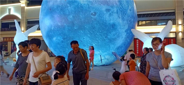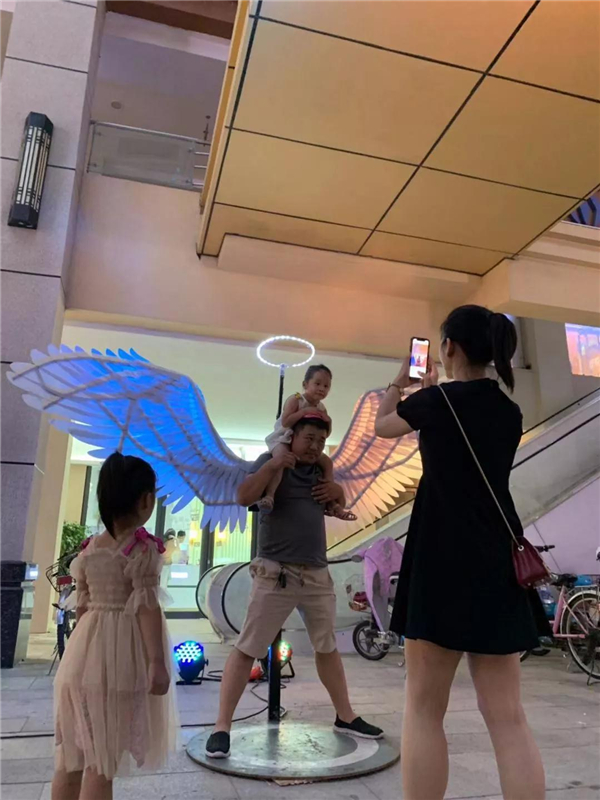 傍晚时刻万达金街开始人头攒动市民们来来往往络绎不绝 有的拿起手机拍照记录下浪漫、美丽的灯光秀还有年轻人在广场上尽情跳舞、拍摄视频 穿过时光隧道在闪烁的灯海之中梦幻旅程即刻开启 超级月亮非常震撼契合中秋节的节日气氛一片团圆祥和之景 天使翅膀、城市心跳、擎天柱等各种造型充满着网红气息吸引了许多人围观、拍照