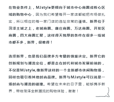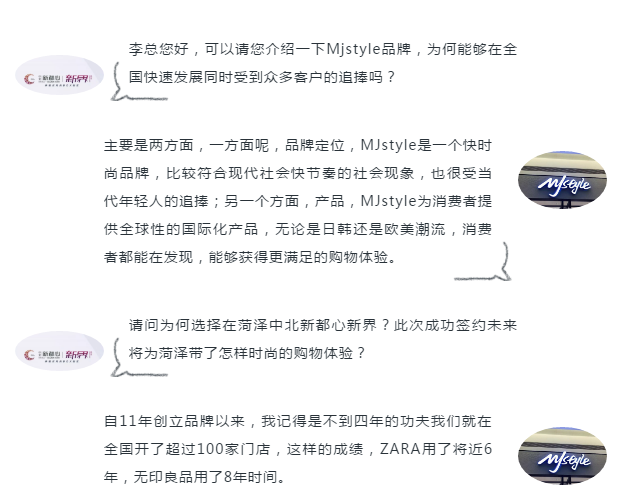 如果你关注购物中心快时尚品牌,除了ZARA、H&M外,MJstyle你也一定不会陌生。 快时尚生活式品牌MJstyle作为笕尚零售核心品牌,快速吸取全球流行的前沿设计灵感与理念,创造出品类繁多的商品、以极具竞争力的定价,最大程度满足人们对时尚品质生活不断更新的诉求。而其定位快时尚综合零售概念的品牌核心优势赢得了全球消费者们的亲睐和热捧。 2019年9月19日,以“共新界 改变菏泽”为主题的新界招商盛典在菏泽华美达酒店顺利举行。Mjstyle华北区拓展总监李总等嘉宾莅临活动,并在现场达成战略合作签约。