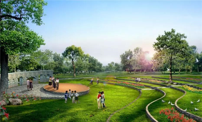 先来到中北·新都心后花园——15万方环城大堤生态景观公园。菏泽市环城大堤始建于1522年,在老城区形成特色独具的“外圆内方”城市格局,是菏泽最宝贵的历史文化遗产之一。