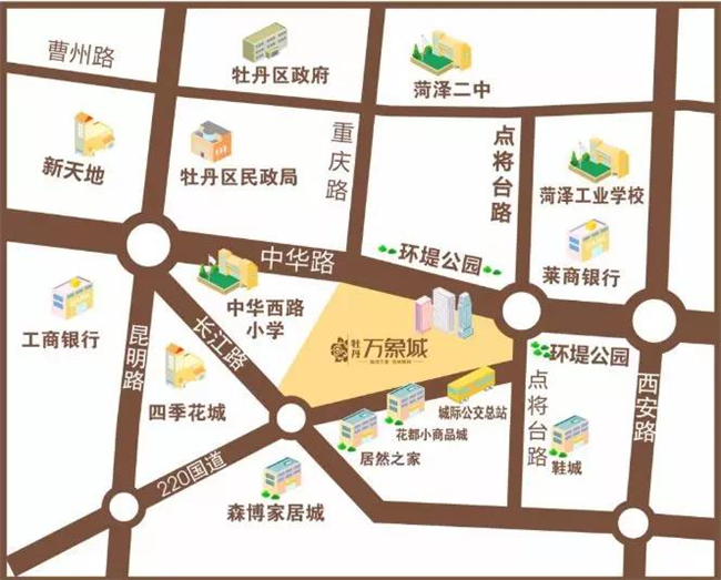 牡丹万象城位于西城商圈的核心位置,城市向西发展的重点板块。中华路、220国道、点将台路在此交汇,多条主干道联通,通达性强;城际公交总站、城区多条公交终点站就在项目对面,项目周边多条公交站点、公共自行车站点、共享电车站点等,出行十分便利。