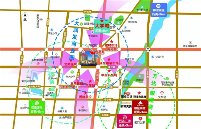 三大商圈(东方红大街老商圈、万达银座商圈、大润发商圈)中心