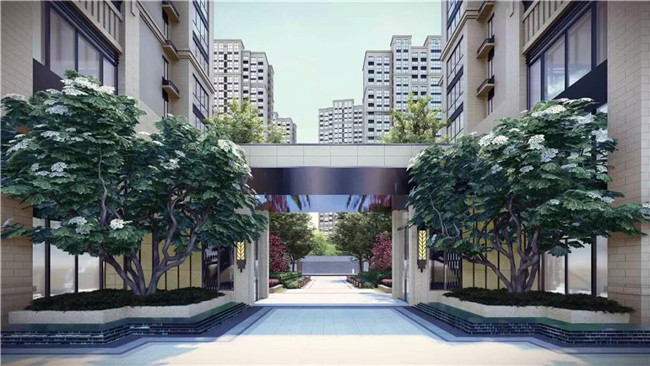 社区园林为新中式风格,大堂式入口、镜面水体、景观树阵、草阶、落差水池、跳泉、阳伞、观赏廊架等细节,