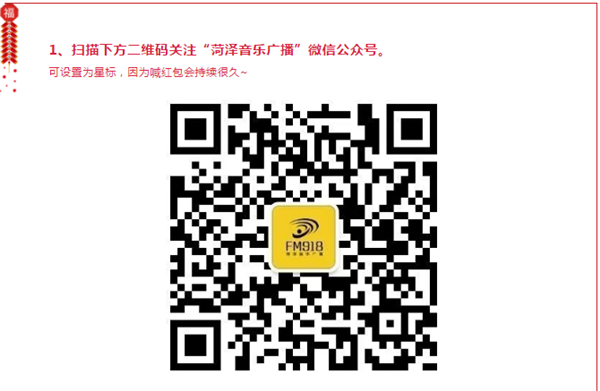 1、扫描下方二维码关注“菏泽音乐广播”微信公众号。可设置为星标,因为喊红包会持续很久~