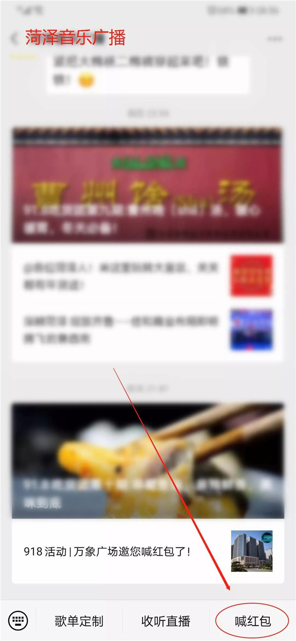喊红包时不要在菏泽音乐广播公众号内直接喊,而是选择右下角“喊红包”进入喊红包界面