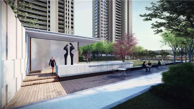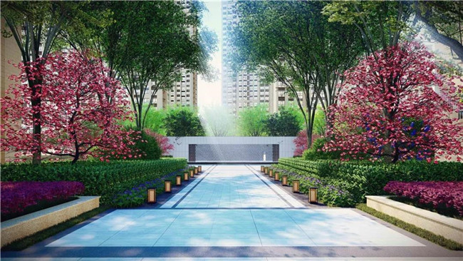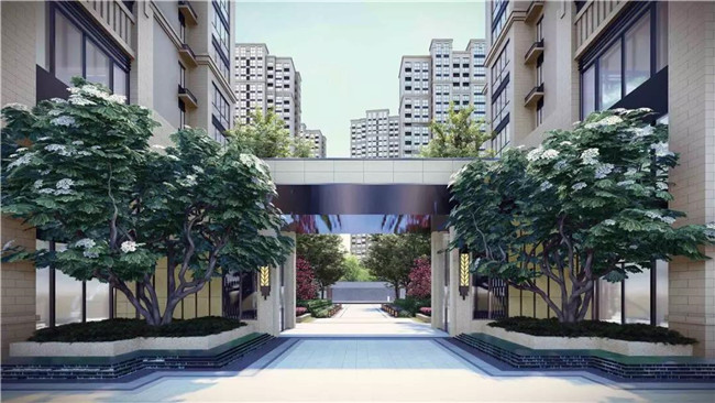 社区园林为新中式风格,大堂式入口、镜面水体、景观树阵、草阶、落差水池、跳泉、阳伞、观赏廊架等细节,由外至内,处处彰显高端社区的典雅华贵。