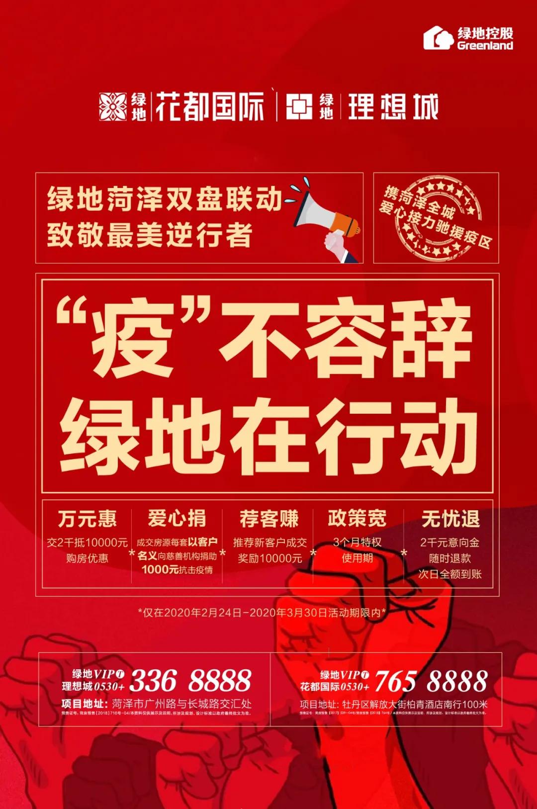 2020年2月24日-3月30日,绿地花都国际与绿地理想城,秉持“做政府所想,为市场所需”的企业理念,以多项利民政策,携手全城共献爱心,以世界品牌力量,与疫区人民同舟共济,全面助力一线工作者战胜疫情。