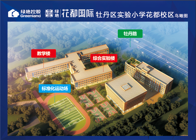 为满足居民入学需求,项目规划建设一所18班制幼儿园,36班制小学及9年一贯制学校一所,形成1个社区3所学校的教育配置,目前规划小学教学楼主体已经完成封顶,签约牡丹区实验小学,2018年9月1日开始招生工作,2020年1月18日,牡丹区实验小学花都校区扩建动工仪式在花都校区隆重举行,扩建后花都校区将增至72个标准教学班,优先保障项目内商品房购房业主适龄子女入学需求。
