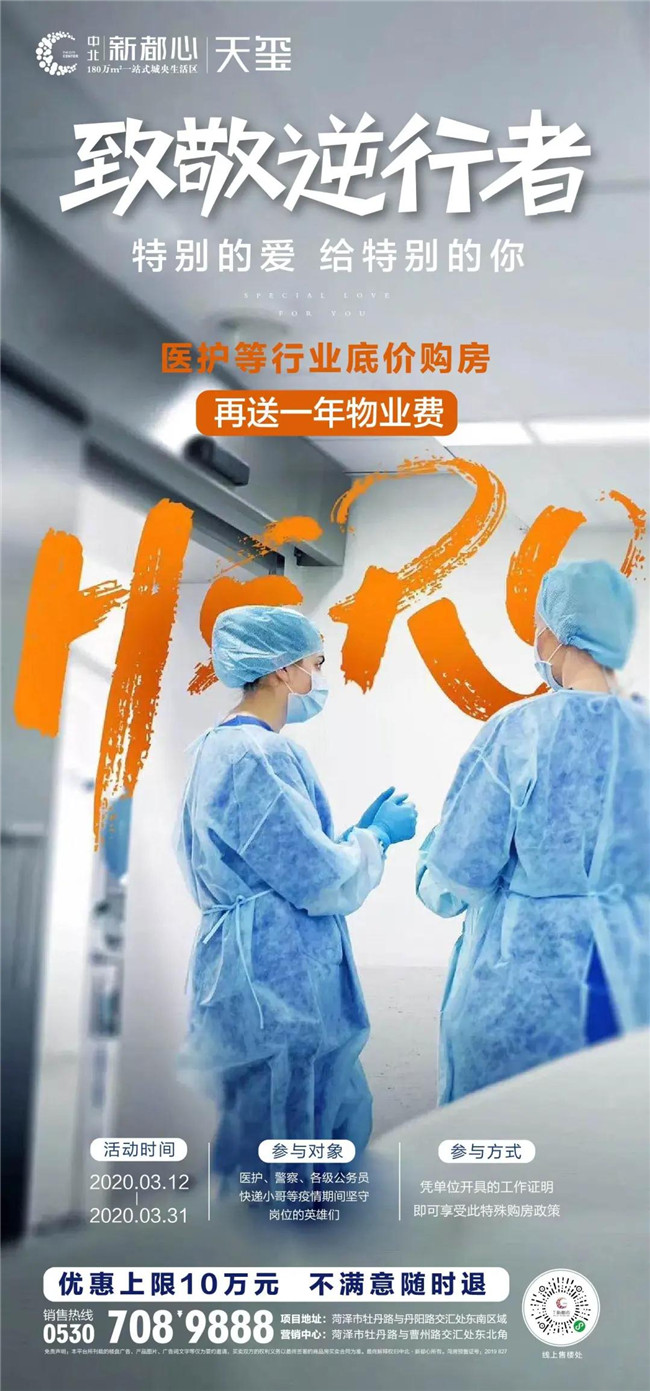 中北·新都心为回报社会,特针对医护、警察、各级公务员、快递小哥等(包括但不限于以上行业)在疫情期间坚守岗位的逆行英雄,制定特殊优惠政策: 在现有“拼团价6100元/㎡起”+“每天1套特价房,优惠上限10万元”基础上,底价购房,再送一年物业费!以实际行动温暖奋战在一线的逆行者,为这个被悲伤笼罩的季节,增添一道人性之光。