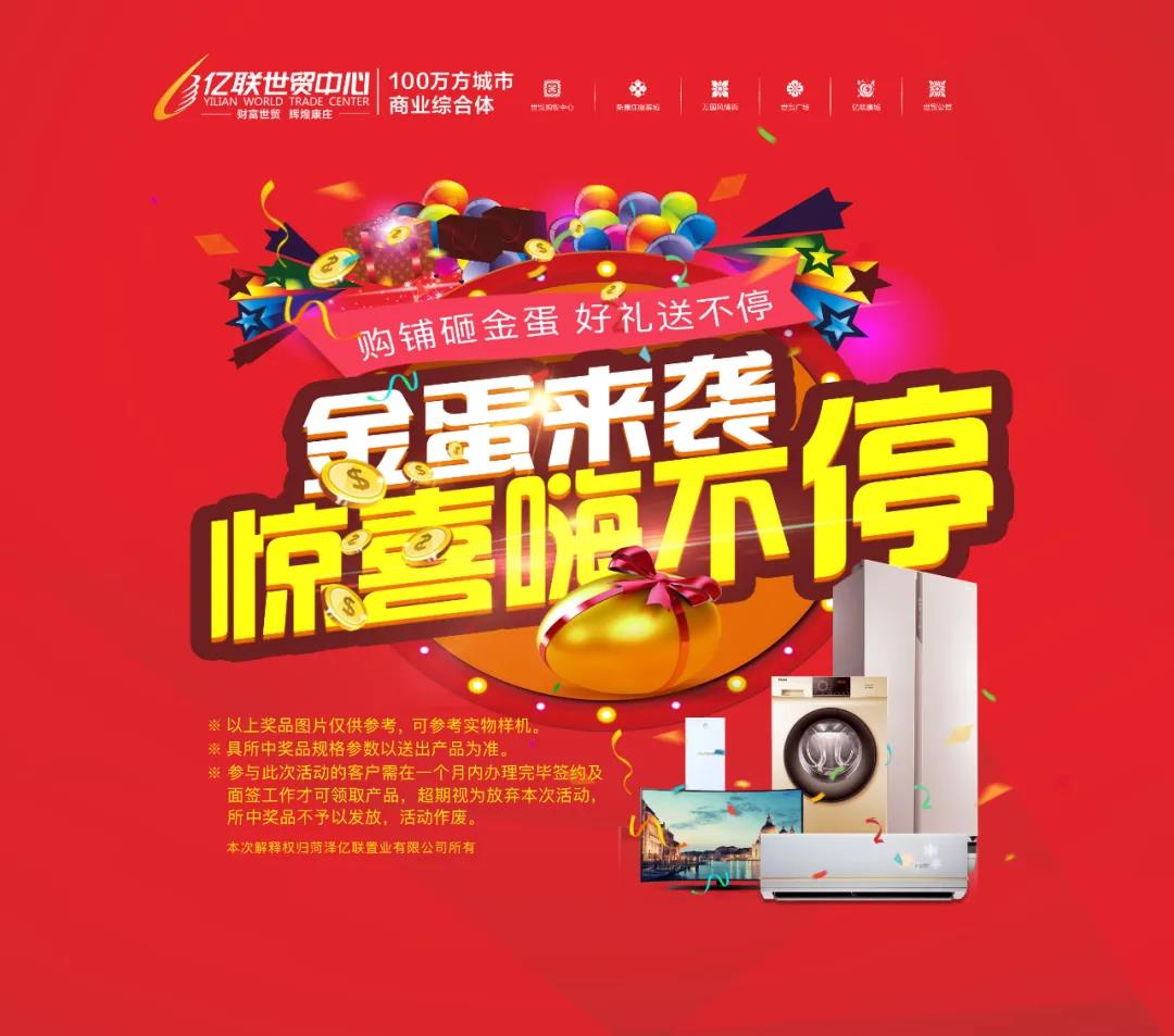 好消息!即日起购买亿联世贸中心在售商品,均有机会砸金蛋获豪华大礼。