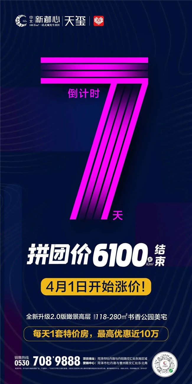 小编预料到价格要涨,但没想到来得这么突然,中北新都心2020年4月1日起正式涨价!那些为孩子上学着急上火的家长、那些为子女结婚踏破铁鞋的父母、那些深藏老城情结的老曹州人......小编郑重提醒大家:拼团月最后一周,拼团价6100元/㎡起倒计时仅剩7天!抄底买房的日子可真不多了~