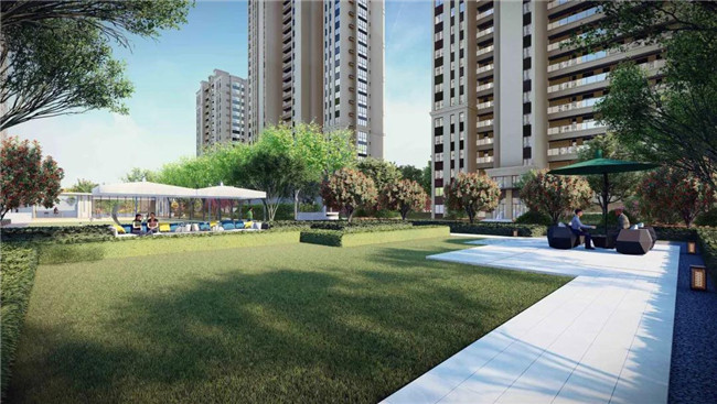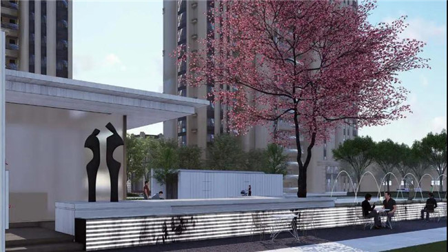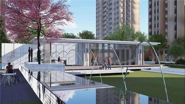 4号地天玺组团园林为新中式现代风格,遵循“自然、阳光、人文、健康、运动"的设计理念,大堂式入口、镜面水体、对景墙、景观树阵、1200㎡户外大草坪、草阶、跌水落差水池、跳泉、室外阳伞、观赏廊架、主题雕塑、入户仪式铺装、塑胶地垫等细节,由外至内,形成层层递进的归家仪式,处处彰显高端社区的典雅华贵。
