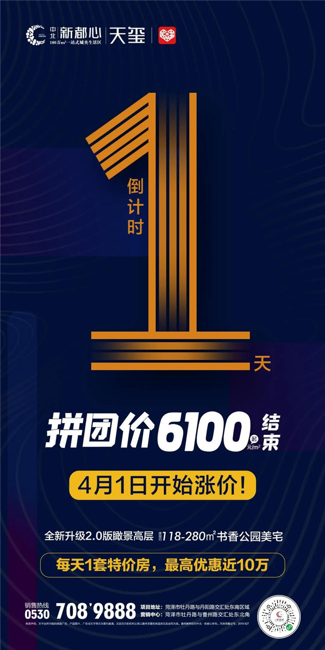 小编预料到价格要涨,但没想到来得如此突然,中北新都心2020年4月1日起正式涨价!那些为孩子上学着急上火的家长、那些为子女结婚踏破铁鞋的父母、那些深藏老城情结的老曹州人......小编郑重提醒大家:拼团月最后一天!拼团价6100元/㎡起倒计时仅剩1天!抄底买房的日子只有几个小时了~
