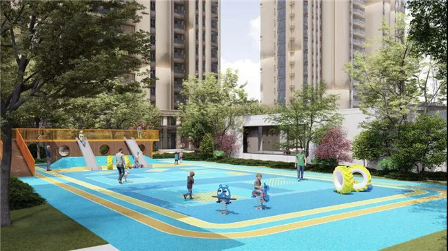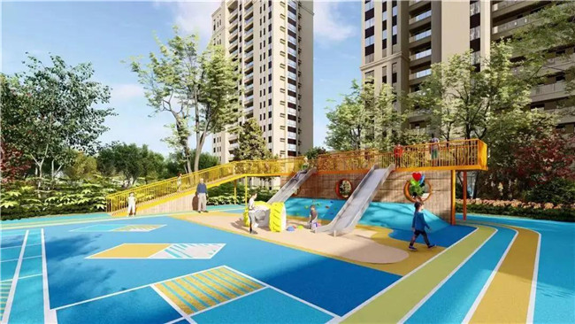 4号地天玺组团规划活动广场、塑胶跑道、塑胶地垫、绿地背景音乐和老年休闲区、大龄儿童游乐区、低龄儿童游乐区等一系列
