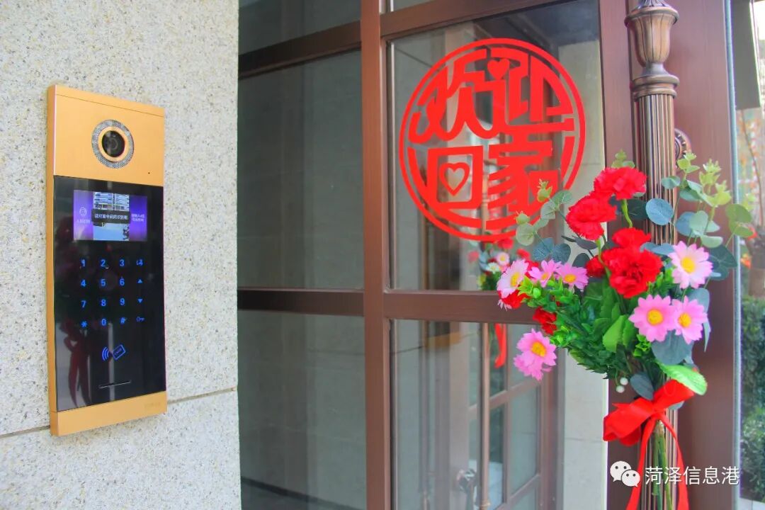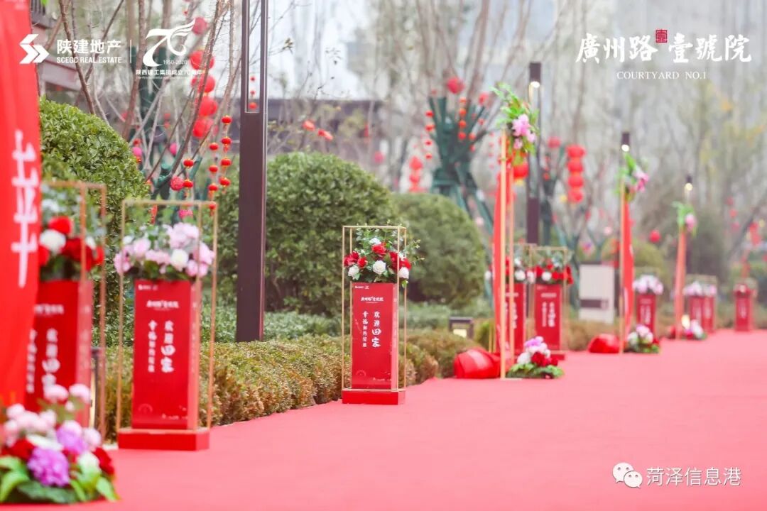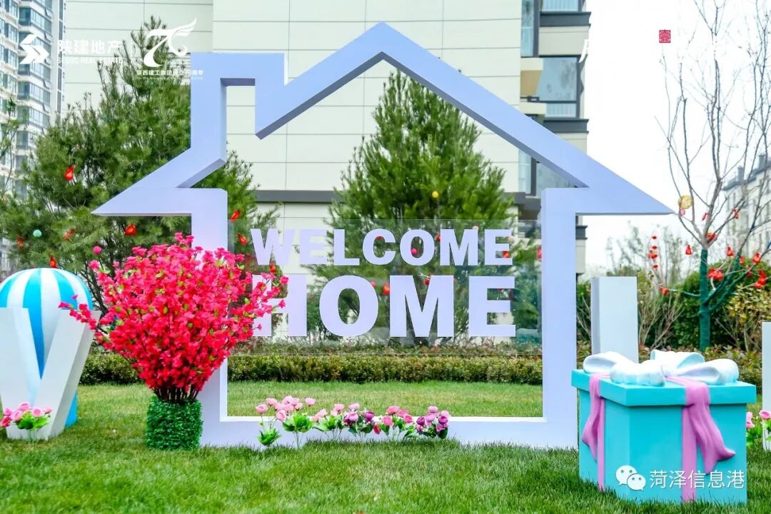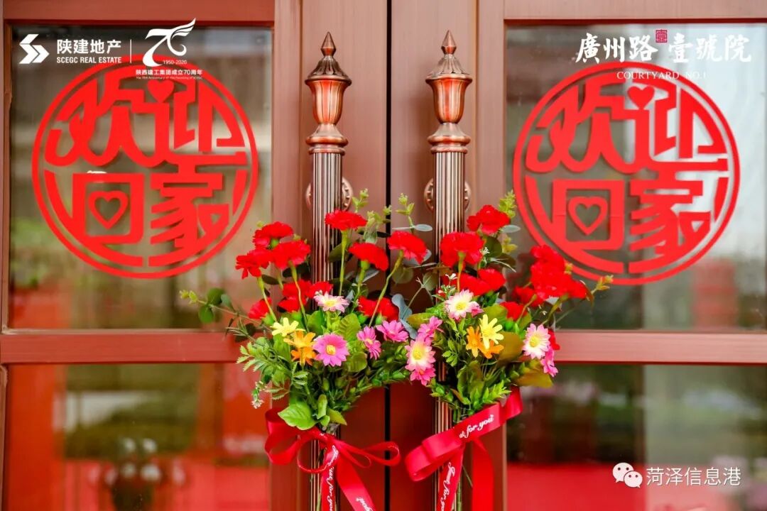 每栋楼的单元外,都整齐摆放着花柱,与红地毯遥相呼应。单元入户门,干净的玻璃上贴上了“欢迎回家”的卡片,美好如约,幸福起航。门把手处用红色鲜花装饰,让回家的路,更温馨。